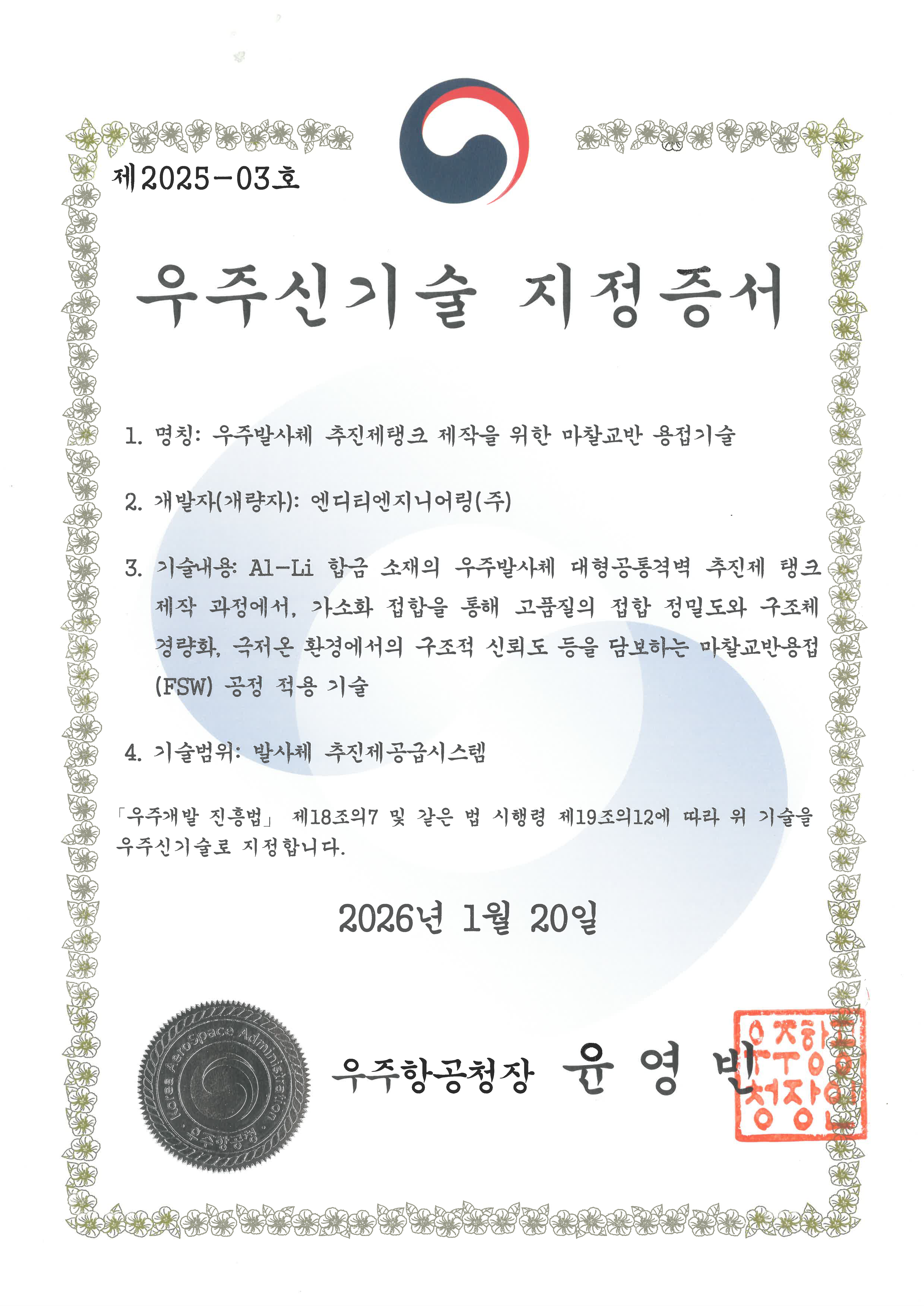 박판 알미늄소재에 대한 마찰교반용접 (Friction Stir Welding) 기술을 바탕으로 우주 발사체 경량화와 안정성에 이바지하며, 끝없는 우주를 향해 도전합니다.